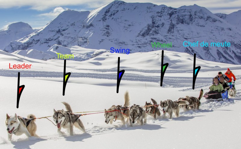 Un parallèle évident se trace entre un attelage de chiens et un groupe de travail efficace d’humains. Et il est crucial de comprendre une toute première distinction qu’ont entre eux le leader et le dominant. Si mener et diriger le groupe est laissé au leader, alors contrôler et maintenir ou rétablir une situation est la prérogative du dominant.