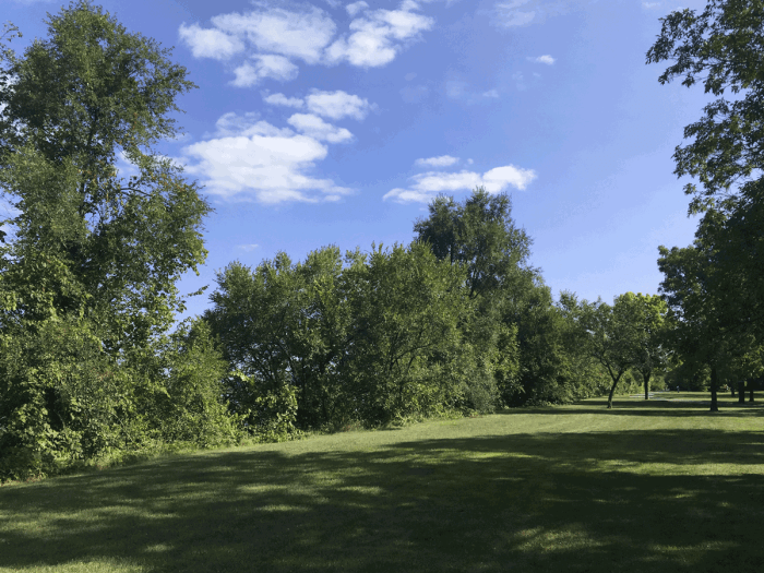 Les bosquets environnants regorgent d’oiseaux discrets, parulines, sittelles, chardonnerets, mésanges et étourneaux, mais la chaleur les cloue sur place, les rendant invisibles puisque les prédateurs rôdent en permanence. Le parc se situe à une dizaine de mètres au-dessus du niveau d’eau actuel. Au printemps, la rivière en crue atteint sa bordure. Le boulevard Gouin tout près est parfois inondé. La différence des niveaux saisonniers est impressionnante, et ce malgré les barrages régulant les débits. Maintenant, c’est tout le contraire et la navigation de plaisance peine à éviter les hauts-fonds. Tant mieux, ça fait moins de moteurs pour la polluer.